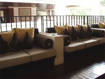 長い廊下にずらりと並ぶソファ。