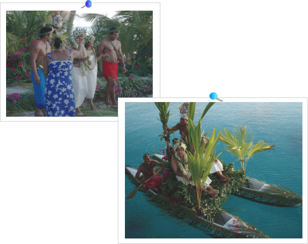 | 『午後4時。レストランの庭で結婚式があります。 よかったら一緒にお祝いしてあげて下さいね』 部屋に届いたメッセージ・カード フランス語はちんぷんかんぷんのはずなのに なぜか直感でわかってしまった 新郎新婦の幸せオーラのおかげかな 最初から最後まで笑い声の耐えない挙式 きっとこれが ポリネシアの人々の生き方そのもの 大勢のゲストからかけられる祝福の声に ちょっぴり照れた表情を浮かべる花嫁さんは 夕陽に染まる海よりも美しい 二人別々に乗ってきたカヌーがひとつに結ばれて 新しい人生が 静かに海に滑り出していきました |